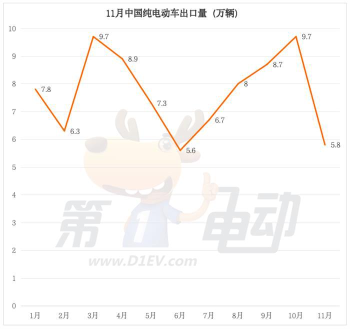 根据易车公布的中国汽车出口量数据,11月中国汽车(包含商用车)出口量达到40万辆,环比下滑10%,同比上涨6.2%。其中新能源车出口量达8万辆,环比下滑34%,同比下滑5.9%;纯电动车出口量达5.8万辆,环比大降40%,同比大降23%。