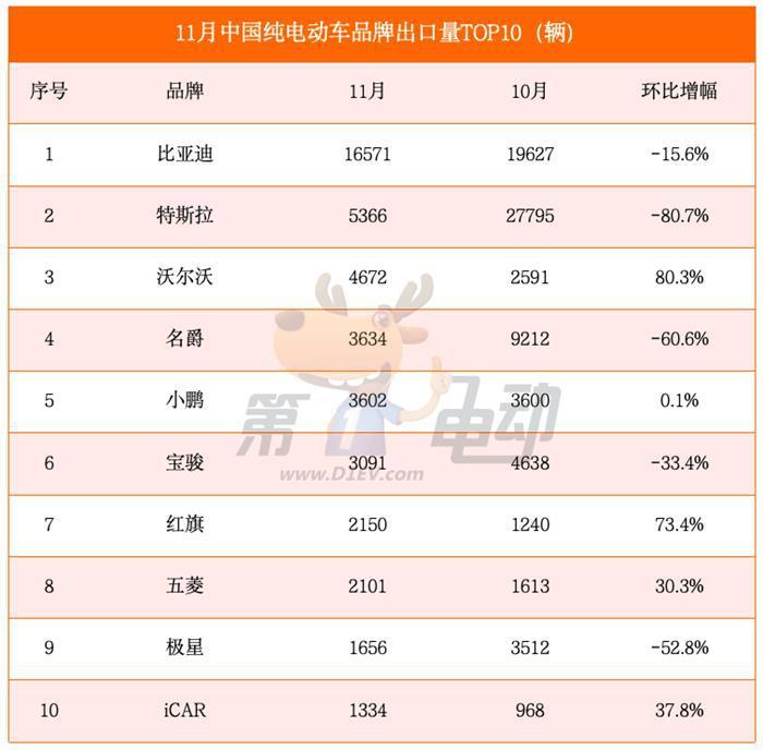与之相反,11个品牌出口量出现下滑,其中特斯拉、长安、星途和极星出口量环比均大降超30%,尤其是特斯拉出口量大降81%,仅5366来那个,排名从10月前五直降至第17。