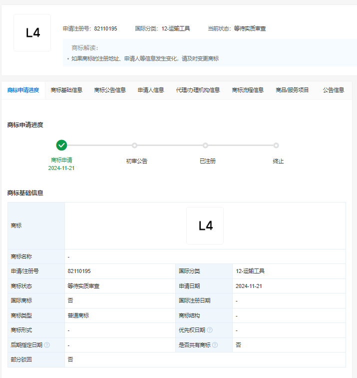 12月20日消息,据天眼查显示,理想汽车关联公司北京车和家信息技术有限公司申请注册一枚“L4”商标,国际分类为运输工具,当前商标状态为等待实质审查。