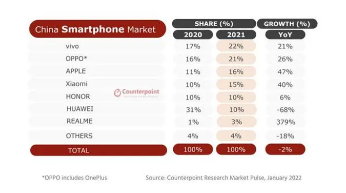 根据第三方研究机构Counterpoint 的报告显示,2021年国内智能手机市场份额95%以上均由苹果、华为、OPPO、小米、Vivo 5家头部品牌占据,其余品牌只能分吃零头。