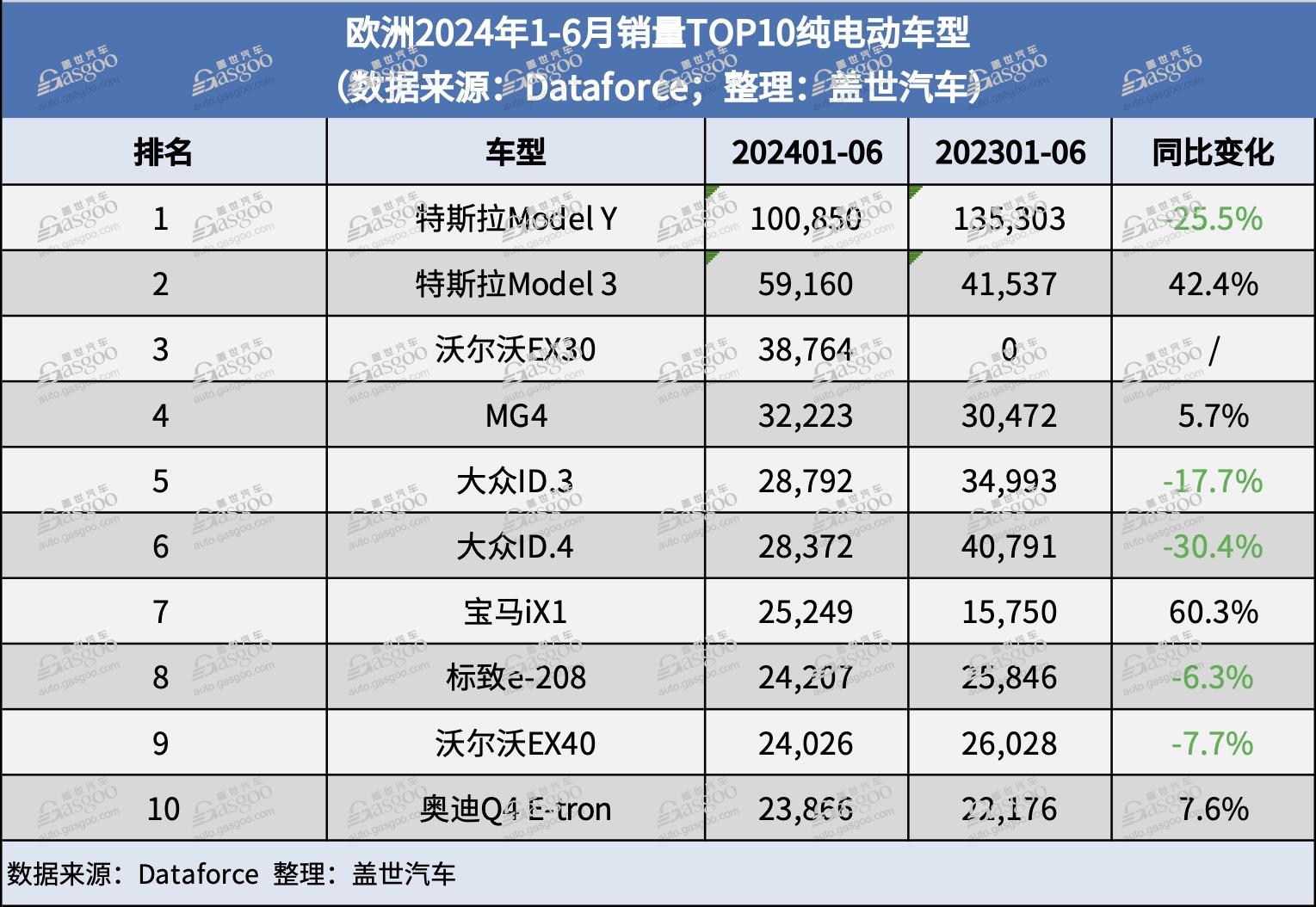 上半年,欧洲市场的电动汽车销量同比微增2.1%,为943,983辆。其中,特斯拉Model Y是欧洲最畅销的电动车型,销量为100,850辆,但比2023年同期下降26%;紧随其后的是特斯拉Model 3,销量为59,160辆,同比上涨42%;排在第三位的是沃尔沃EX30,销量为38,764辆。