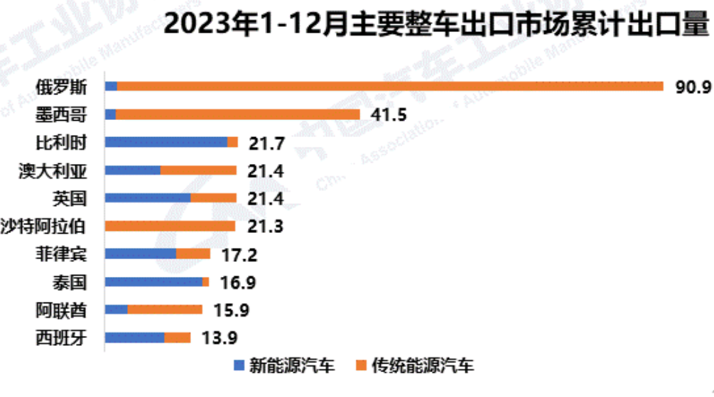 2023年,中国汽车在海外各大市场都得到了一定的持续增长。例如在俄罗斯,中国出口汽车同比暴增481%,占中国汽车出口增量的42%。在俄罗斯去年销量前十的汽车品牌中,中国品牌占据了六个席位,这也使得中国品牌在俄罗斯的市场份额增至51%,俄罗斯因此成为中国汽车出口的第一大国。