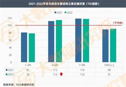 流量进入独立售后的趋势2022年仍在蔓延。日前,F6大数据研究院发布的《2022汽车后市场维保行业白皮书》显示,车龄4-9年的车辆都倾向于选择独立售后(TGI指数大于100),其中车龄4-6年的车辆,也就是目前的行业主流,TGI指数同比上涨。