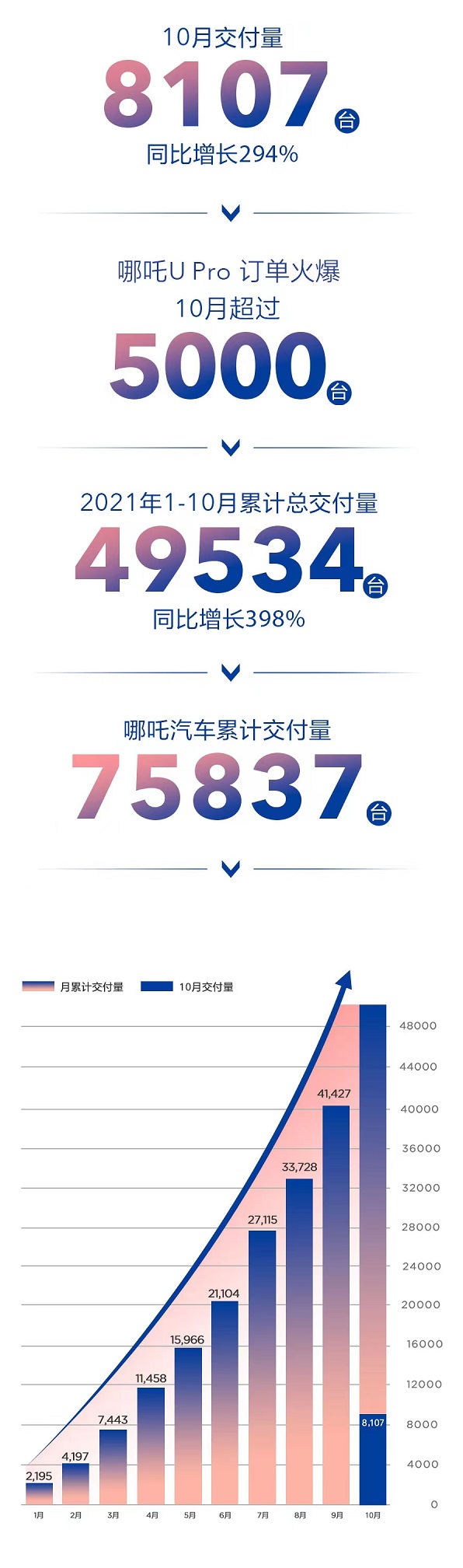 过去的10月,据其官方公布的成绩显示,新车总交付量达到8,107辆,同比增长294%,连续9个月打破交付。2021年1-10月,累计交付量达到49,534辆,同比增长398%。截至今年10月,累计交付总量已达到75,837辆。显然,形式一片大好。