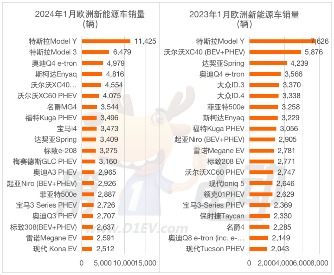 值得一提的是,在TOP20中,中国品牌旗下有三款车(名爵MG4、沃尔沃XC40/XC60)上榜,其中1月名爵MG4销量同比大涨55%至3,544辆,排名跃升至第七,未来有望进入前五。
