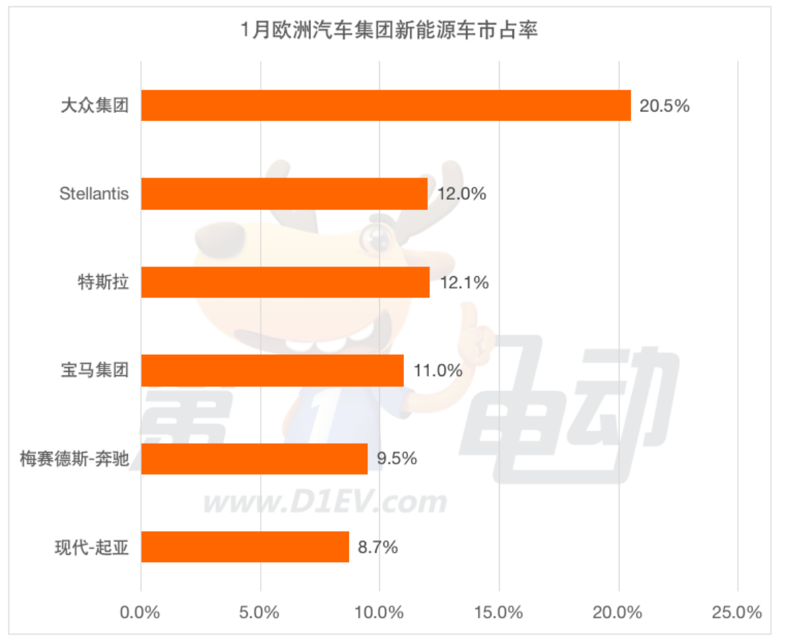 从制造商集团来看,大众汽车集团在今年年初以20.5%的份额领先,这比2023年1月的20.7%略有下降。亚军Stellantis市占率为12%,低于2023年1月的14.1%。因此,大众这家德国企业集团有望在2024年再次轻松获胜。