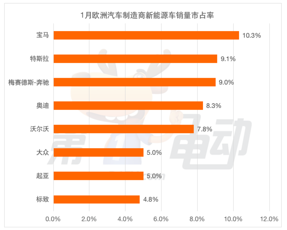 宝马集团(11%)排名第三,与2023年1月相比增长了0.7%,这意味着其将吉利-沃尔沃(9.6%)从领奖台上挤到第四位的位置。