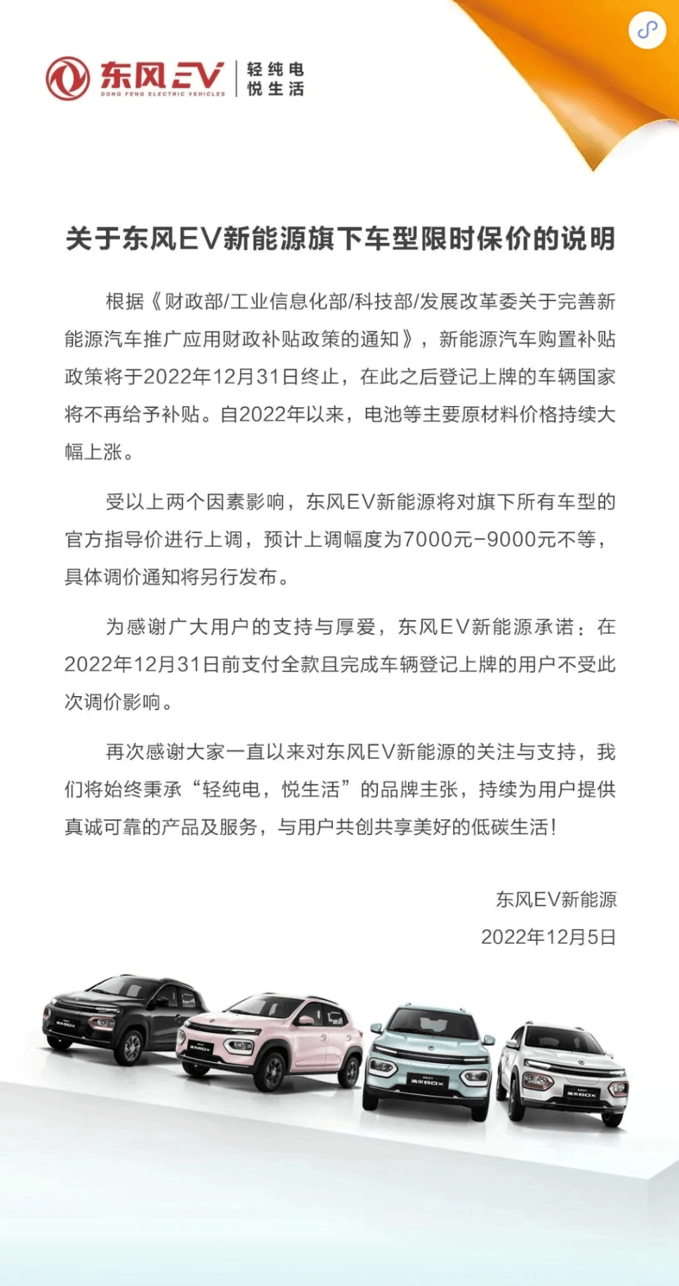 12月5日晚,东风EV新能源发布“关于东风EV新能源旗下车型限时保价的说明”:受“新能源汽车购置补贴政策将于2022年12月31日终止”和“电池等主要原材料价格持续大幅上涨”两个因素影响,东风EV新能源将对旗下所有车型的官方指导价进行上调,预计上调幅度为7000元-9000元不等,具体调价通知将另行发布。