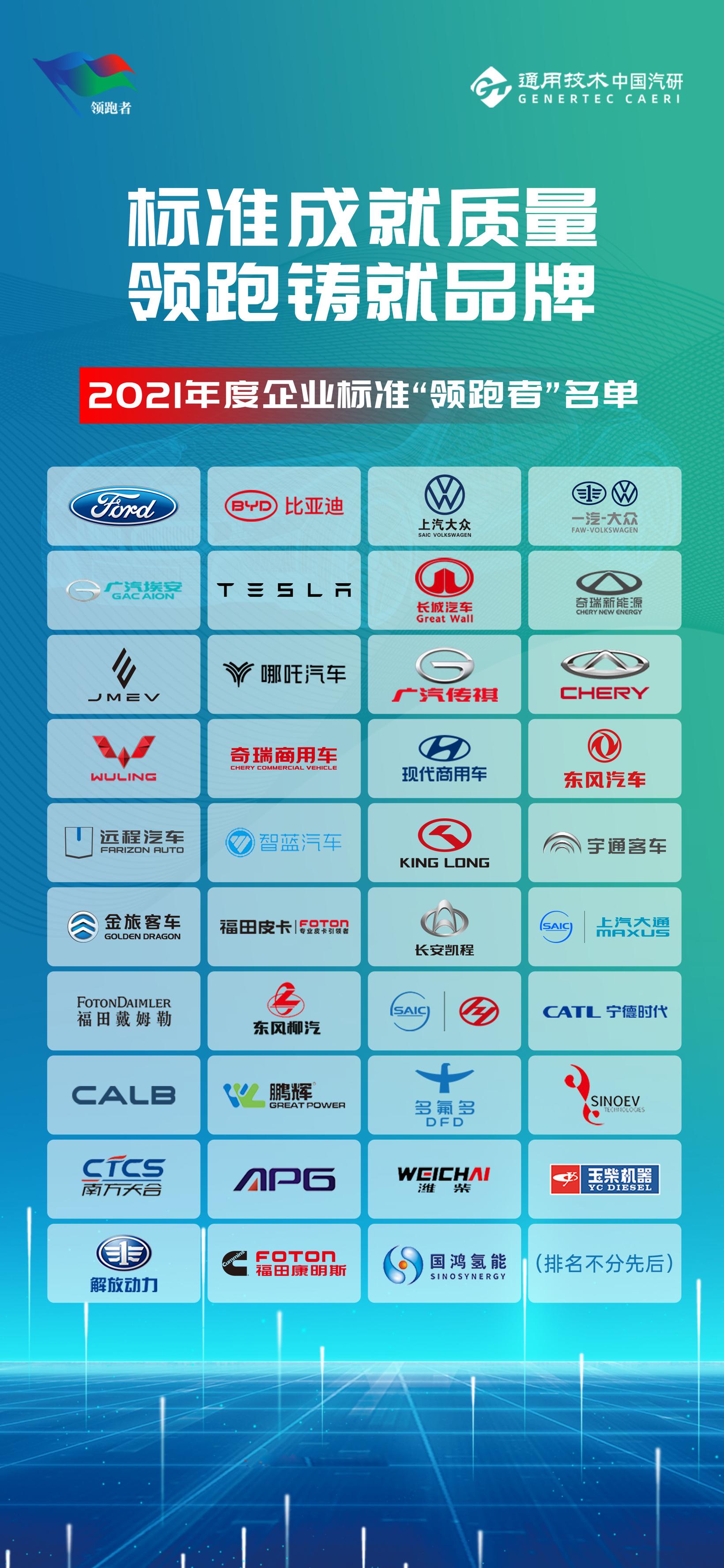 “生产看领跑,消费选领跑”。自2020年汽车行业纳入企业标准“领跑者”重点领域以来,2021年,通用技术中国汽研进一步夯实了评价领域,系统的建立了新能源整车、汽柴油整车、汽车用发动机、汽车零部件及配件4个重点领域、12个细分产品的评价能力,牵头发布了《“领跑者”标准评价要求 纯电动轻型货车》等11项团体标准,开展了共计33个整车、12个关键系统和零部件的企业标准评价工作,有效响应了国家高质量发展战略的要求。